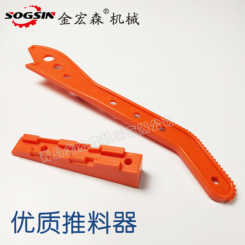 在臺鋸上(或者在臺型電刨上)做直切時,推料桿能讓你的雙手遠離危險。當(dāng)把一塊很寬的木板直切到寬度小于 4 in(10.16cm)時,推料桿就顯得尤為必要。推料桿有各種不同的形狀,通常是用合成板做的,因為合成板不會像實木一樣在不恰當(dāng)?shù)臅r候裂。我喜歡那種上頭向前延伸出去的推料桿,在操作時,向前推它的同時保持下壓就可以了。